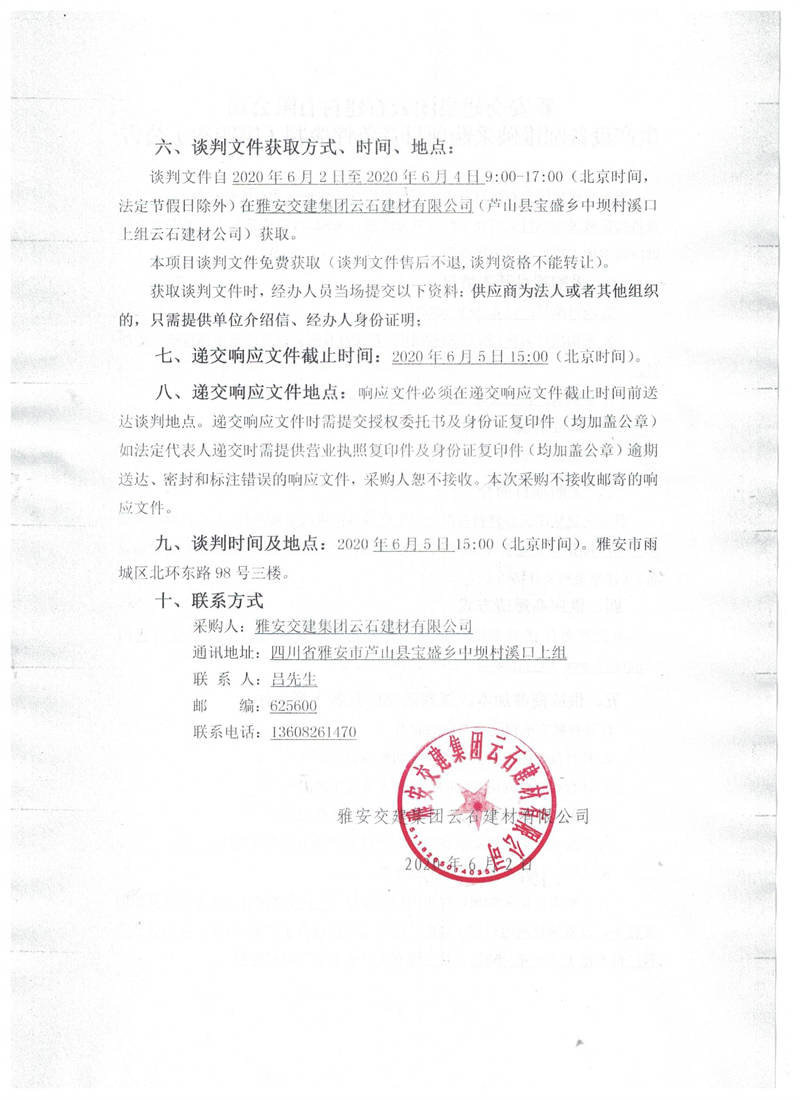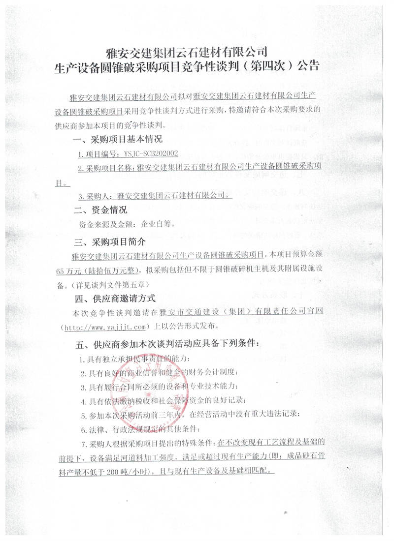 雅安交建集團(tuán)云石建材有限公司生產(chǎn)設(shè)備圓錐破采購項(xiàng)目競爭性談判(第四次)公告