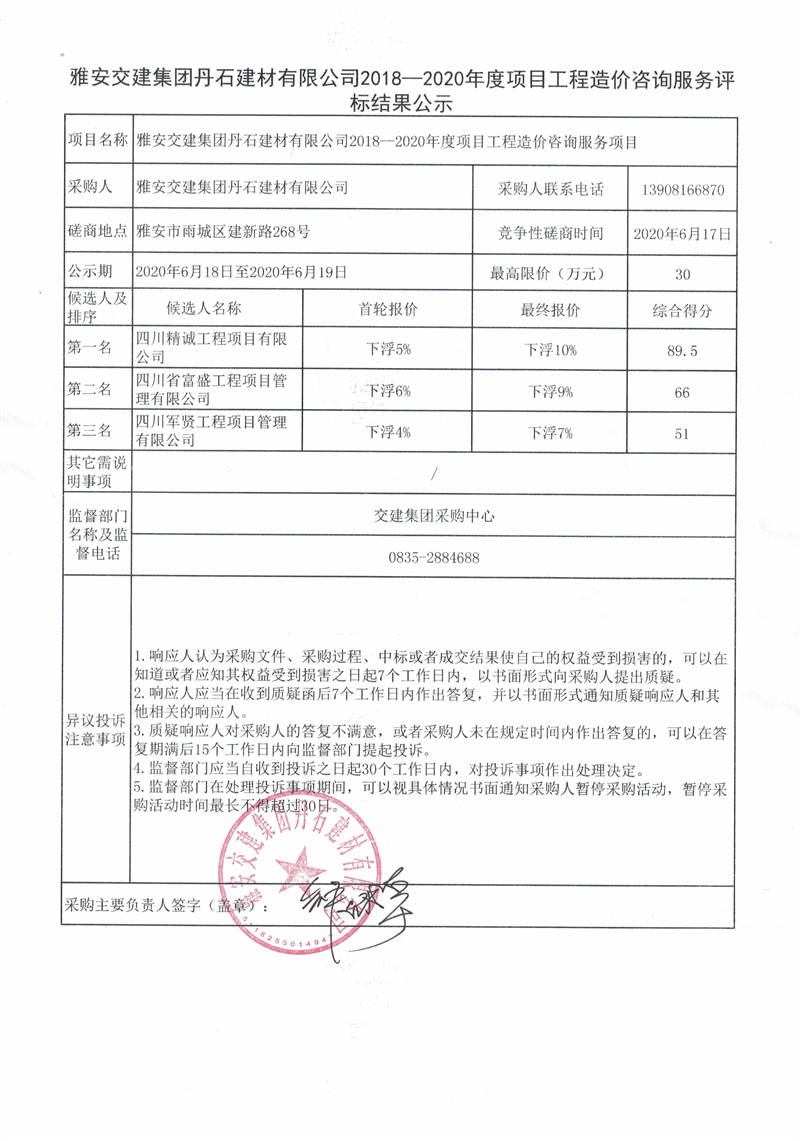 雅安交建集團(tuán)丹石建材有限公司2018—2020年度項目工程造價咨詢服務(wù)評標(biāo)結(jié)果公示
