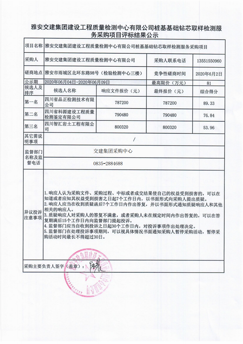 雅安交建集團建設(shè)工程質(zhì)量檢測中心有限公司樁基基礎(chǔ)鉆芯取樣檢測服務(wù)采購項目評標結(jié)果公示