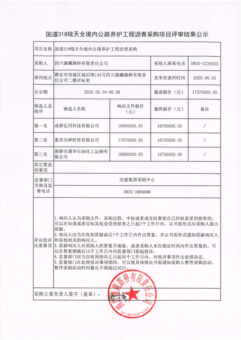 四川康藏路橋有限責(zé)任公司國道318線天全境內(nèi)公路養(yǎng)護工程瀝青采購項目評審結(jié)果公示