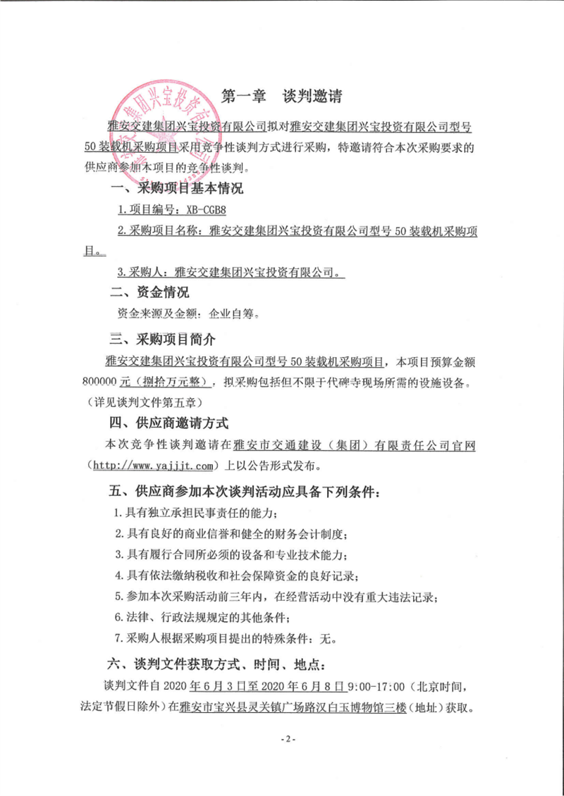 雅安交建集團(tuán)興寶投資有限公司型號(hào)50裝載機(jī)采購項(xiàng)目(第二次)競爭性談判公告