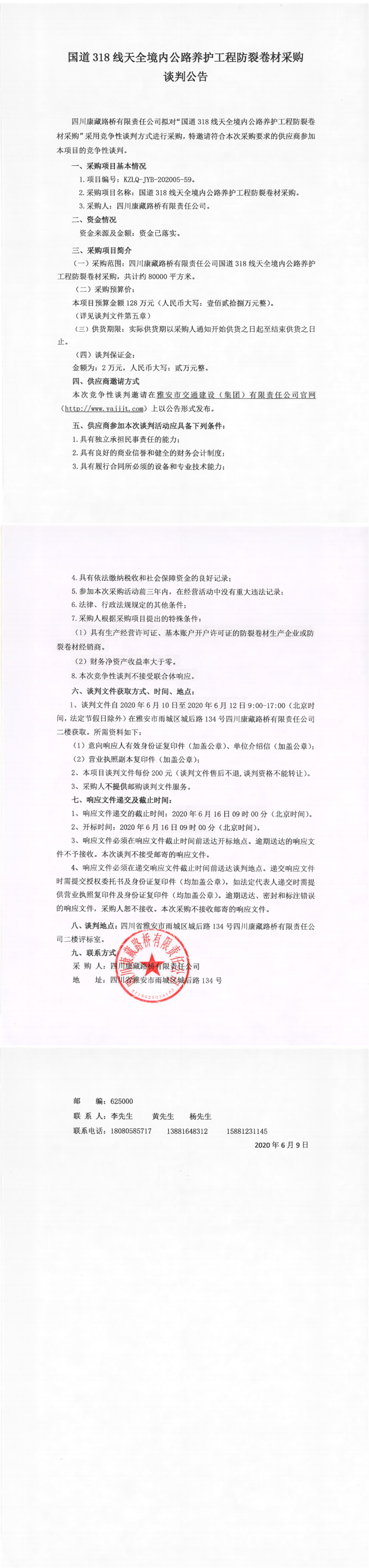 四川康藏路橋有限責(zé)任公司國道318線天全境內(nèi)公路養(yǎng)護工程防裂卷材采購競爭性談判公告
