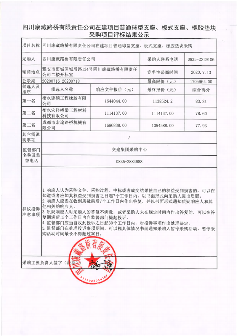 四川康藏路橋有限責(zé)任公司在建項(xiàng)目普通球型支座、板式支座、橡膠墊塊采購項(xiàng)目評(píng)標(biāo)結(jié)果公示