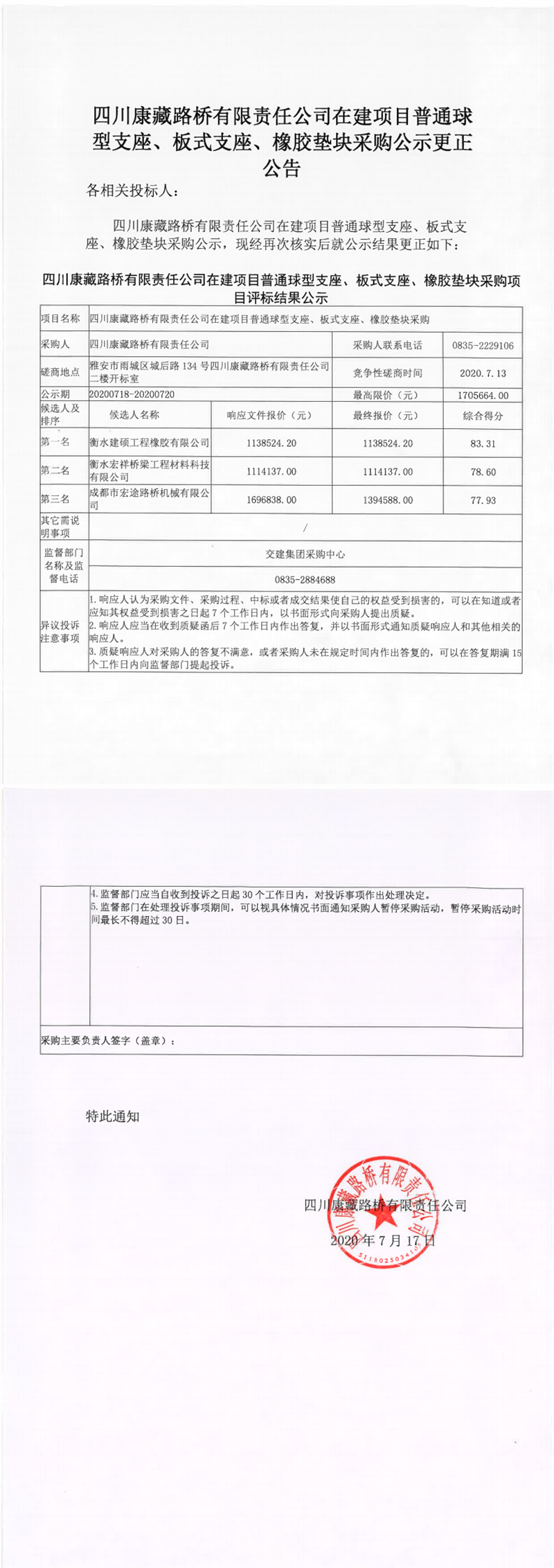 四川康藏路橋有限責(zé)任公司在建項(xiàng)目普通球型支座、板式支座、橡膠墊塊采購公示更正公告