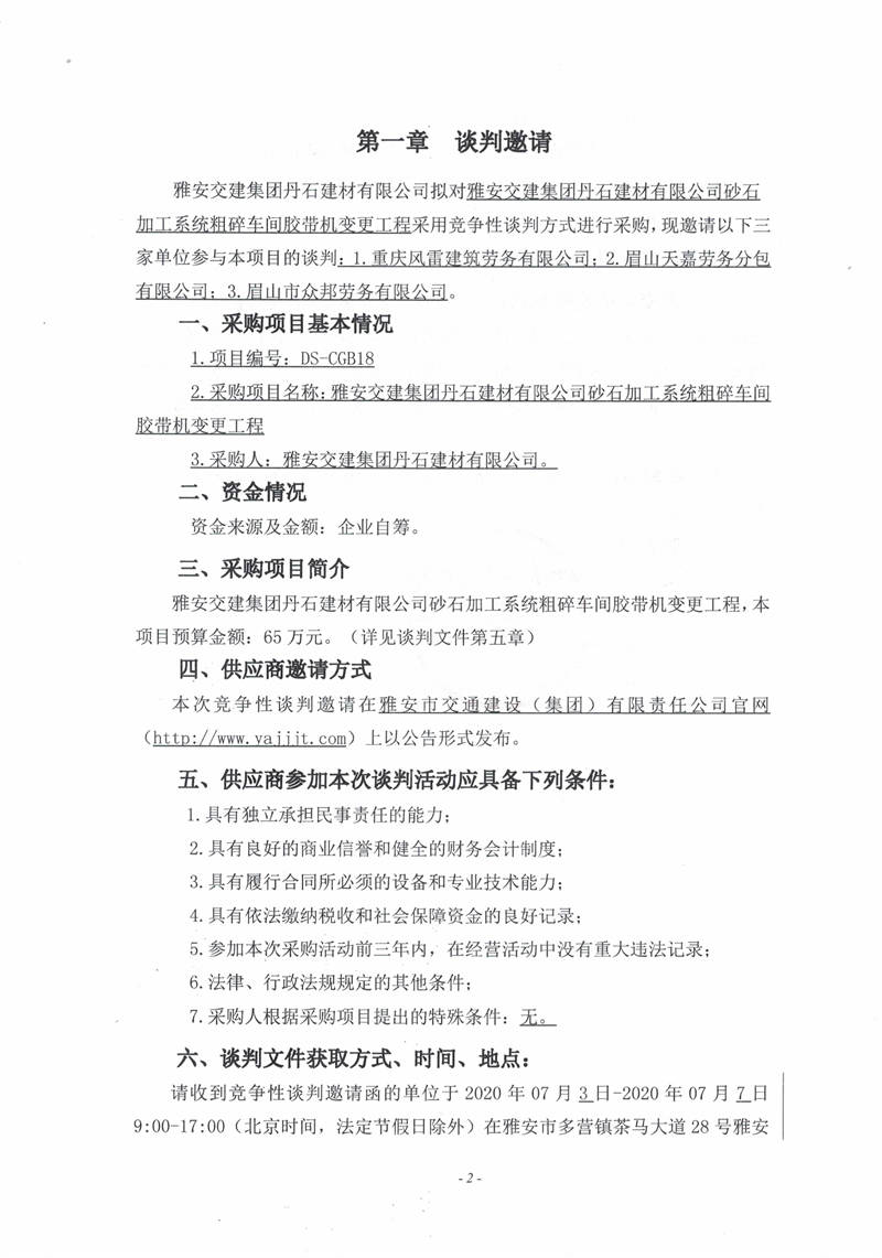 雅安交建集團(tuán)丹石建材有限公司砂石加工系統(tǒng)粗碎車間膠帶機(jī)變更工程競爭性談判邀請(qǐng)公告