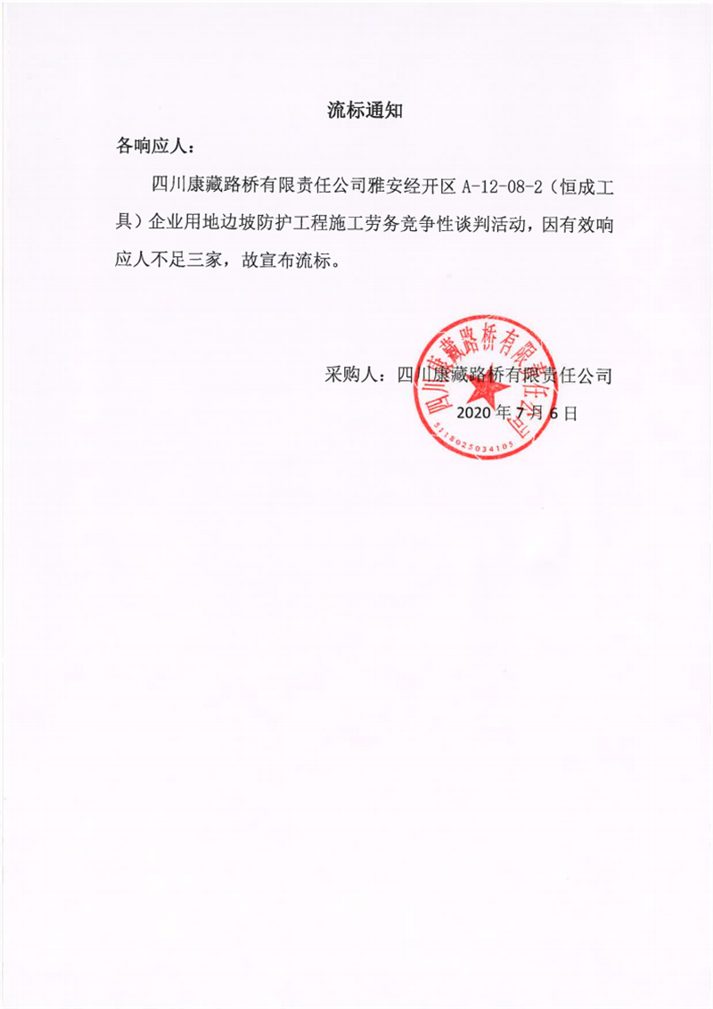 四川康藏路橋有限責任公司雅安經開區(qū)A-12-08-2(恒成工具)企業(yè)用地邊坡防護工程施工勞務流標通知