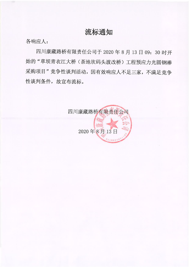 四川康藏路橋有限責(zé)任公司草壩青衣江大橋(茶地坎碼頭渡改橋)工程預(yù)應(yīng)力光圓鋼棒采購(gòu)項(xiàng)目流標(biāo)通知