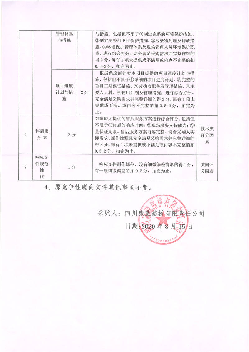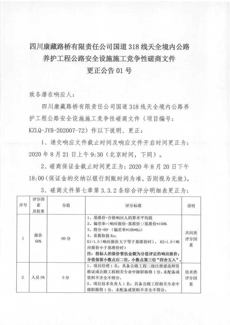 四川康藏路橋有限責(zé)任公司國(guó)道318線(xiàn)天全境內(nèi)公路養(yǎng)護(hù)工程公路安全設(shè)施施工競(jìng)爭(zhēng)性磋商文件更正公告01號(hào)
