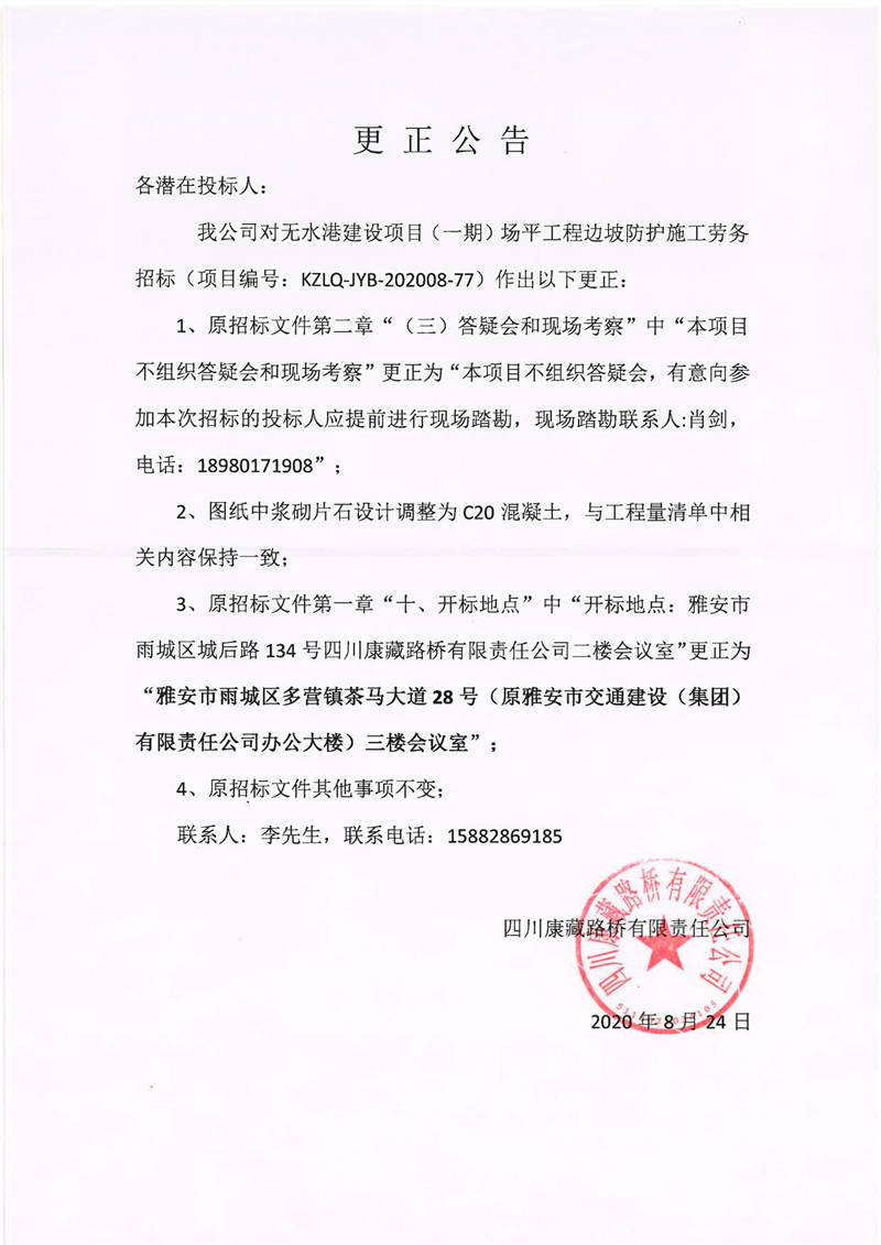 四川康藏路橋有限責(zé)任公司無水港建設(shè)項目(一期)場平工程邊坡防護(hù)施工勞務(wù)招標(biāo)更正公告