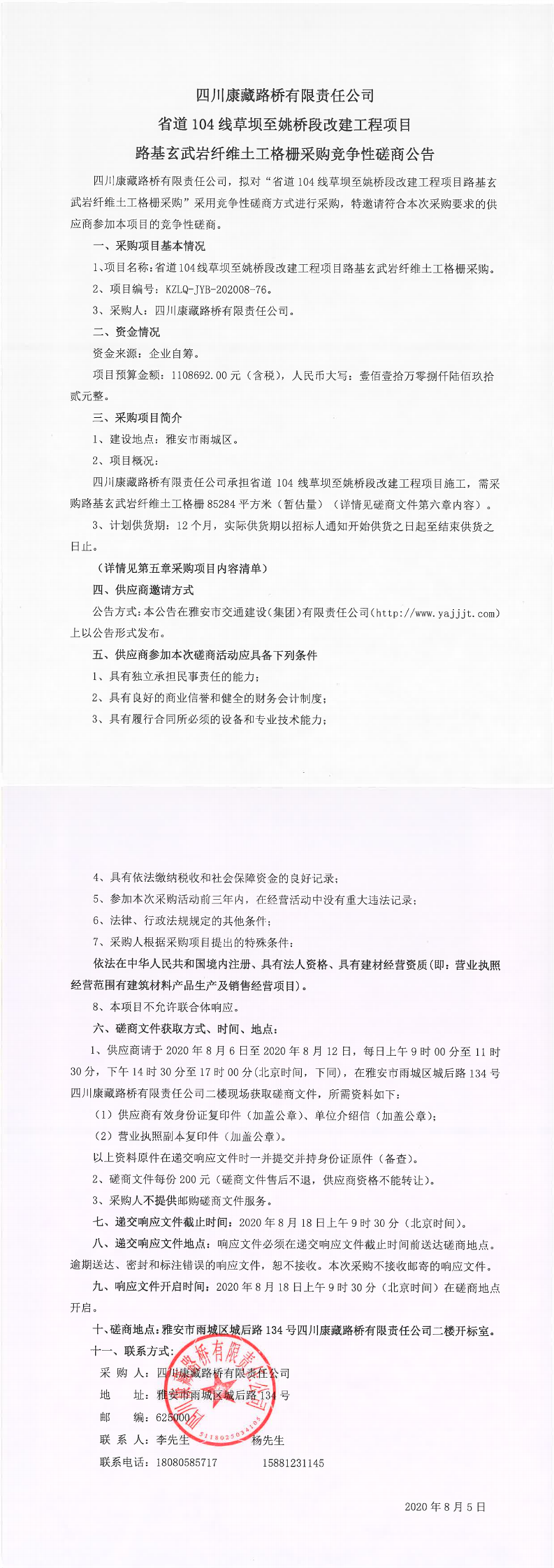 四川康藏路橋有限責任公司省道104線草壩至姚橋段改建工程項目路基玄武巖纖維土工格柵采購競爭性磋商公告
