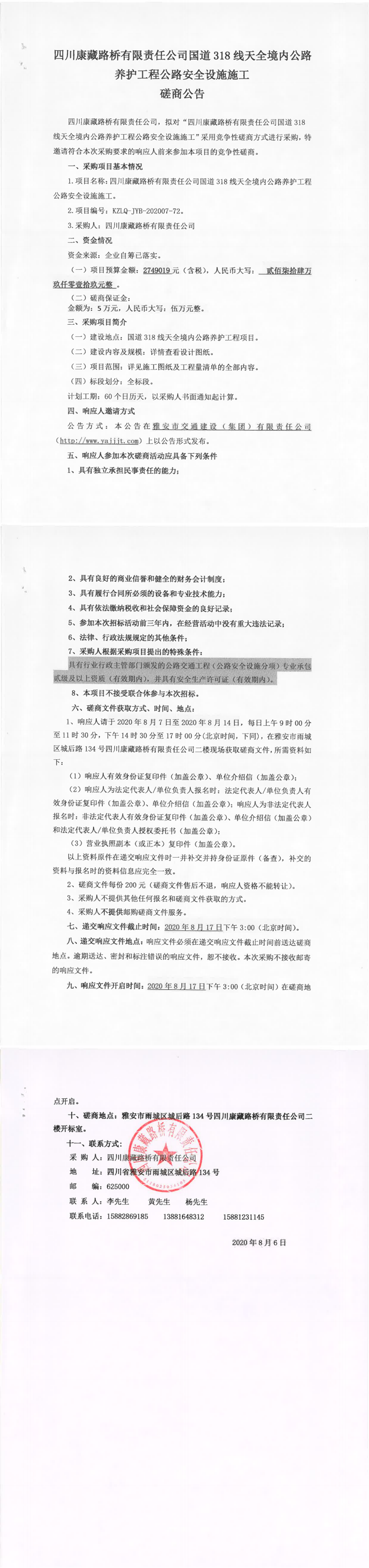 四川康藏路橋有限責任公司國道318線天全境內(nèi)公路養(yǎng)護工程公路安全設施施工磋商公告