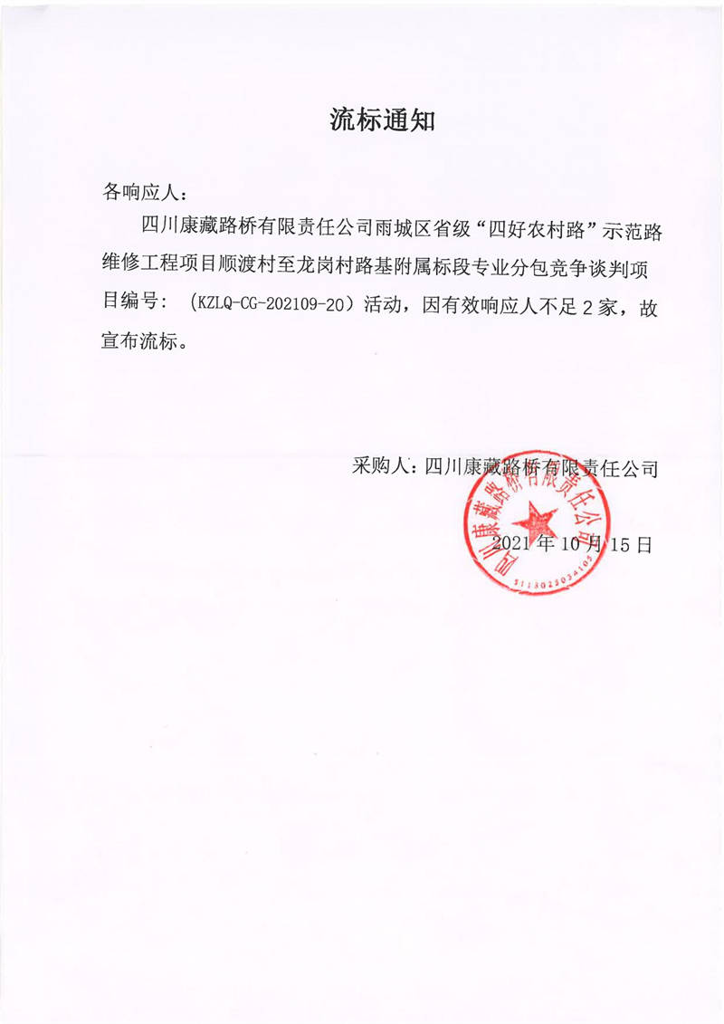 四川康藏路橋有限責(zé)任公司雨城區(qū)省級(jí)“四好農(nóng)村路”示范路維修工程項(xiàng)目順渡村至龍崗村路基附屬標(biāo)段專(zhuān)業(yè)分包流標(biāo)通知