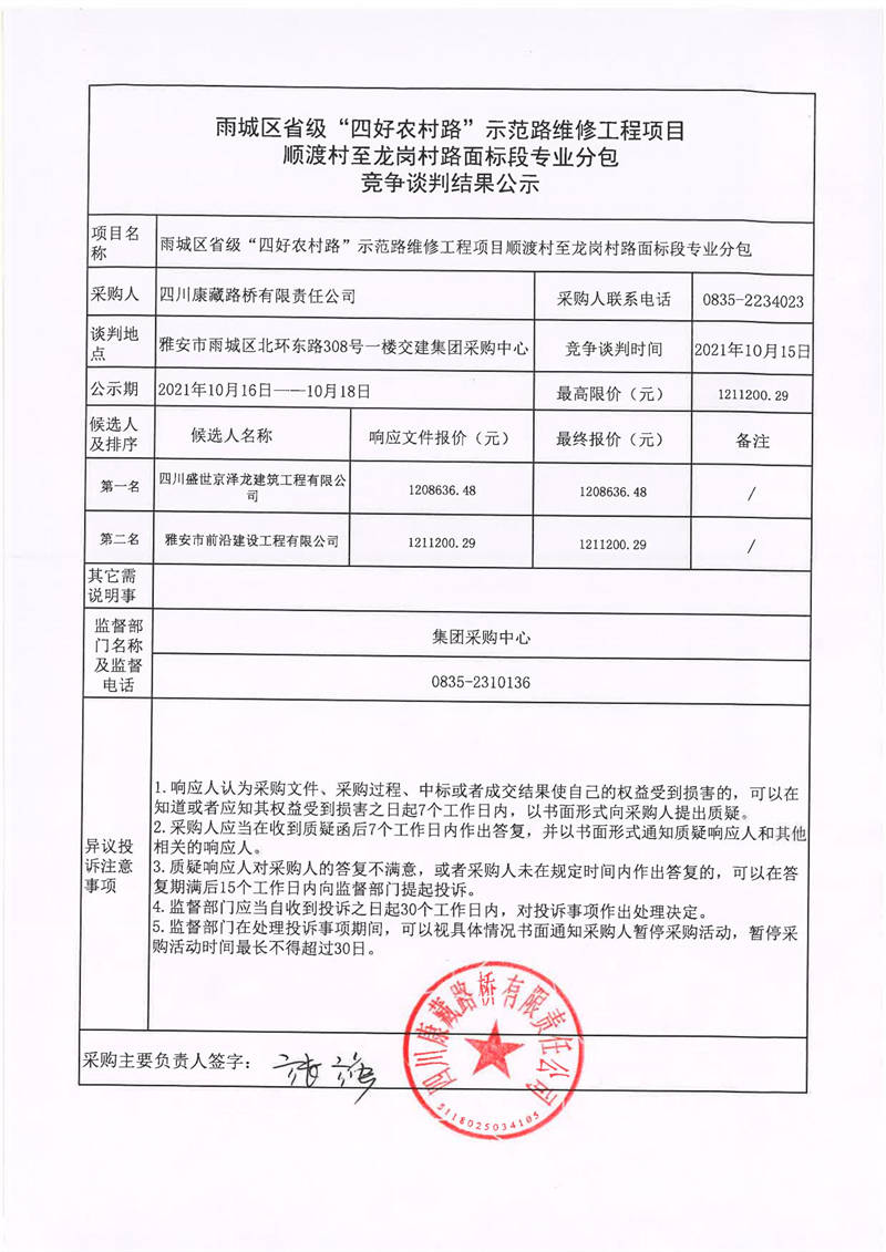 四川康藏路橋有限責任公司雨城區(qū)省級“四好農(nóng)村路”示范路維修工程項目順渡村至龍崗村路面標段專業(yè)分包競爭談判結果公示