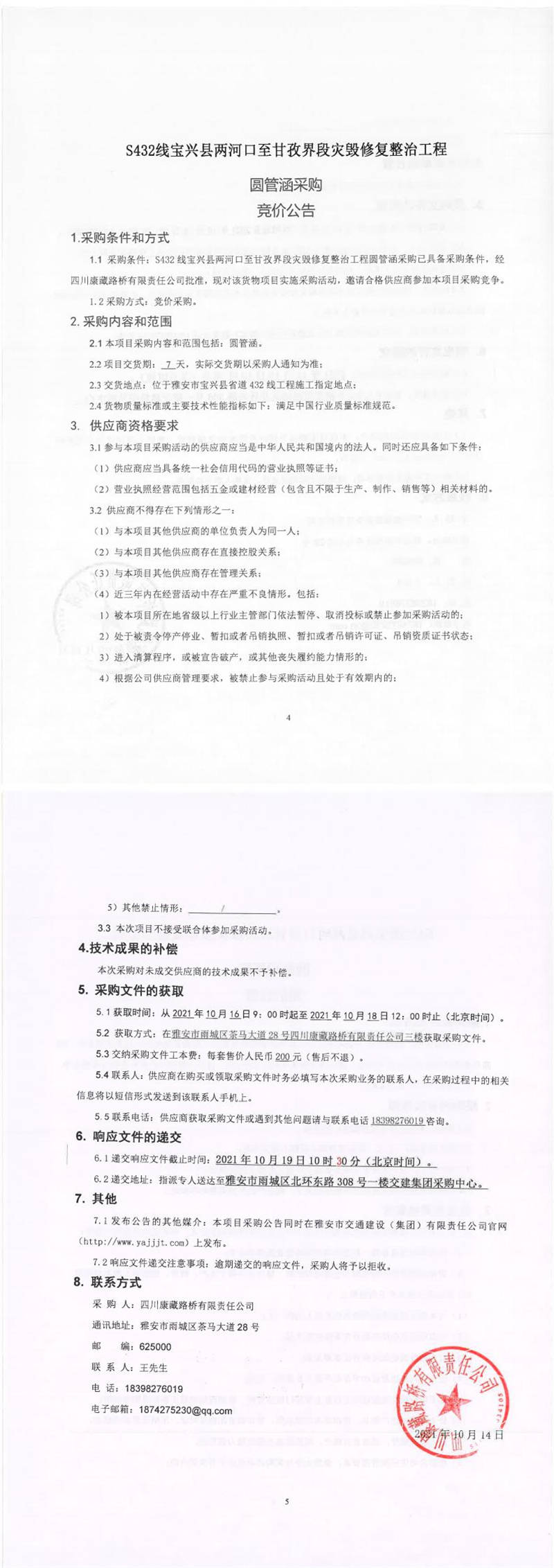 四川康藏路橋有限責(zé)任公司S432線寶興縣兩河口至甘孜界段災(zāi)毀修復(fù)整治工程圓管涵采購競(jìng)價(jià)公告