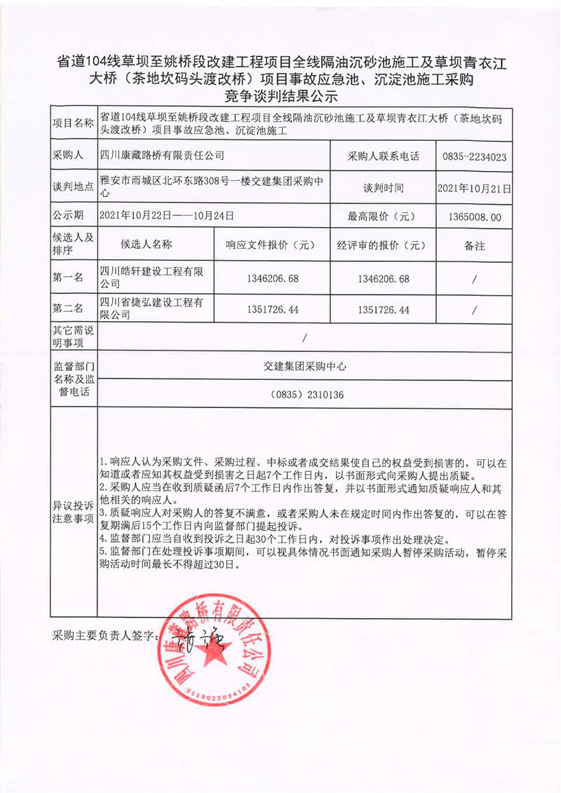 四川康藏路橋有限責(zé)任公司省道104線草壩至姚橋段改建工程項(xiàng)目全線隔油沉砂池施工及草壩青衣江大橋(茶地坎碼頭渡改橋)項(xiàng)目事故應(yīng)急池、沉淀池施工采購競爭談判結(jié)果公示