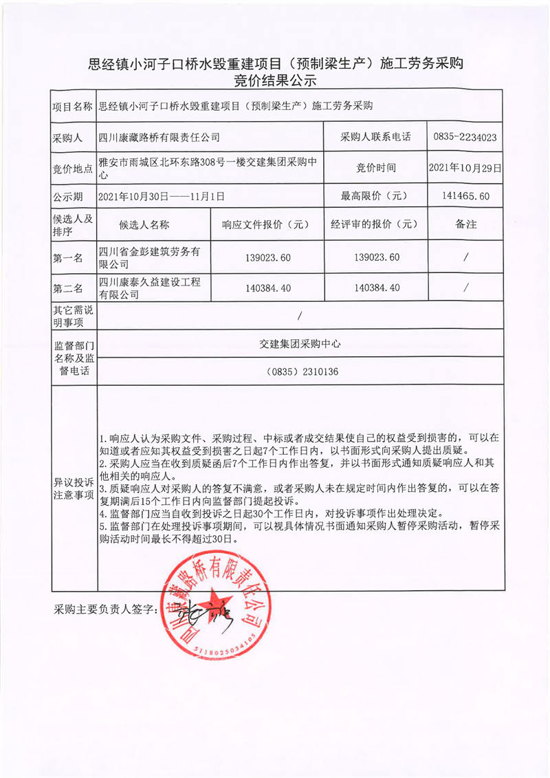 四川康藏路橋有限責(zé)任公司思經(jīng)鎮(zhèn)小河子口橋水毀重建項(xiàng)目(預(yù)制梁生產(chǎn))施工勞務(wù)采購競(jìng)價(jià)結(jié)果公示