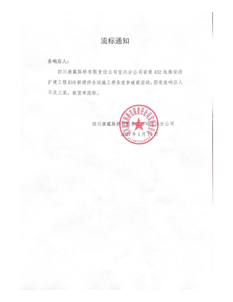 四川康藏路橋有限責任公司寶興分公司省道432線雅安段擴建工程K19新建拌合站施工勞務競爭磋商流標通知