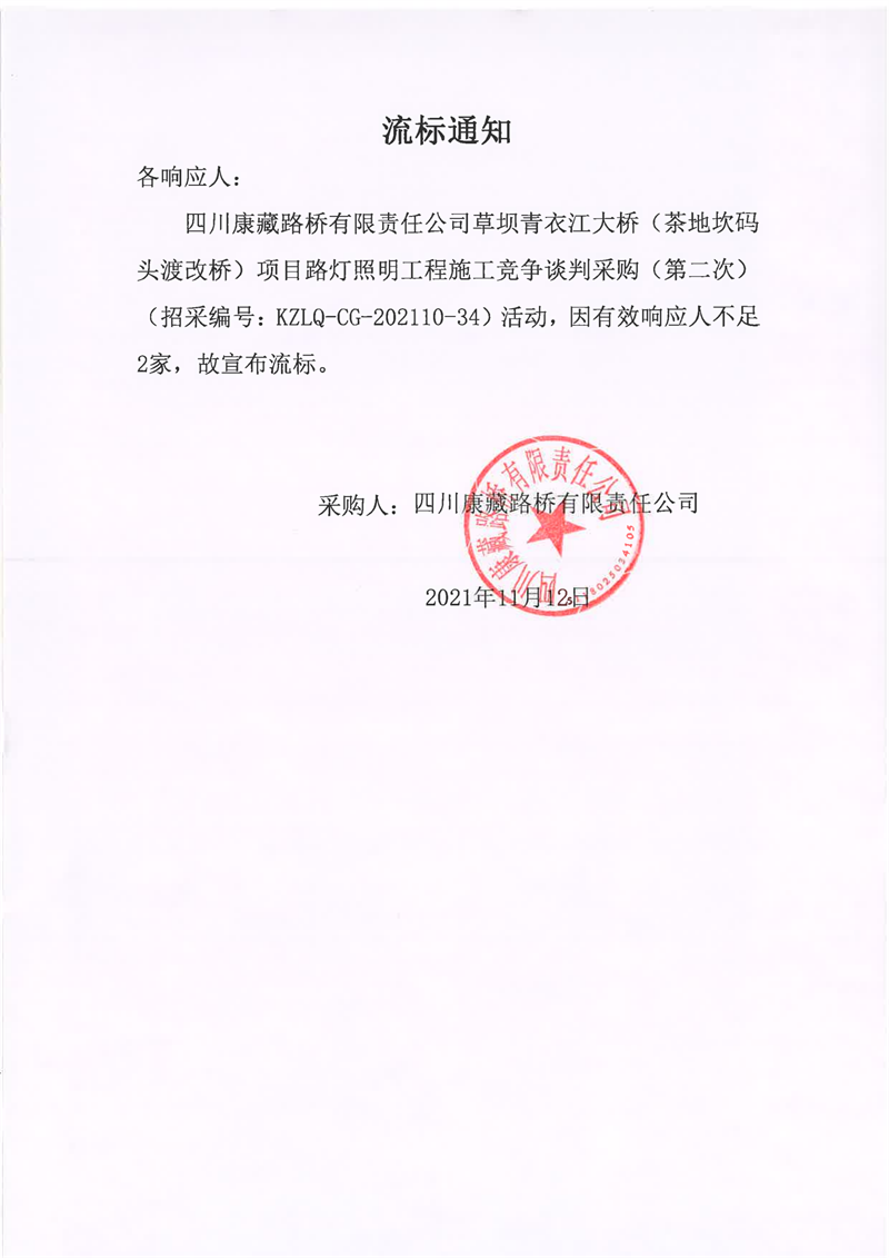 四川康藏路橋有限責(zé)任公司草壩青衣江大橋(茶地坎碼頭渡改橋)項(xiàng)目路燈照明工程施工競爭談判采購(第二次)流標(biāo)通知