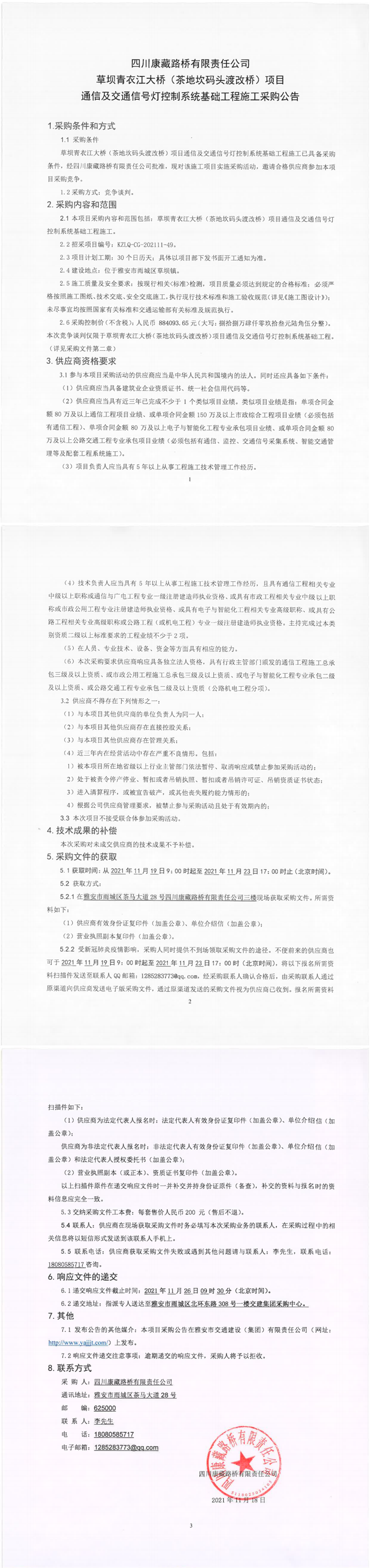 四川康藏路橋有限責任公司草壩青衣江大橋(茶地坎碼頭渡改橋)項目通信及交通信號燈控制系統(tǒng)基礎工程施工采購公告