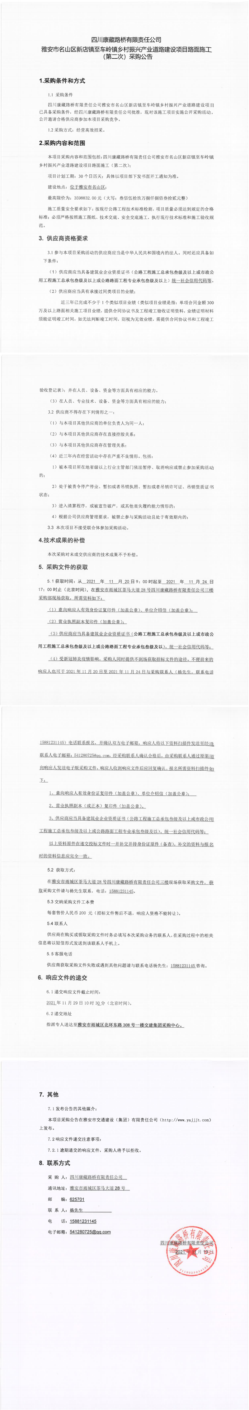 四川康藏路橋有限責任公司雅安市名山區(qū)新店鎮(zhèn)至車嶺鎮(zhèn)鄉(xiāng)村振興產(chǎn)業(yè)道路建設項目路面施工(第二次)采購公告