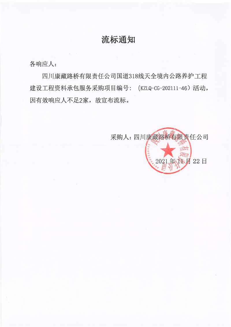 四川康藏路橋有限責任公司國道318線天全境內(nèi)公路養(yǎng)護工程建設工程資料承包服務采購流標通知