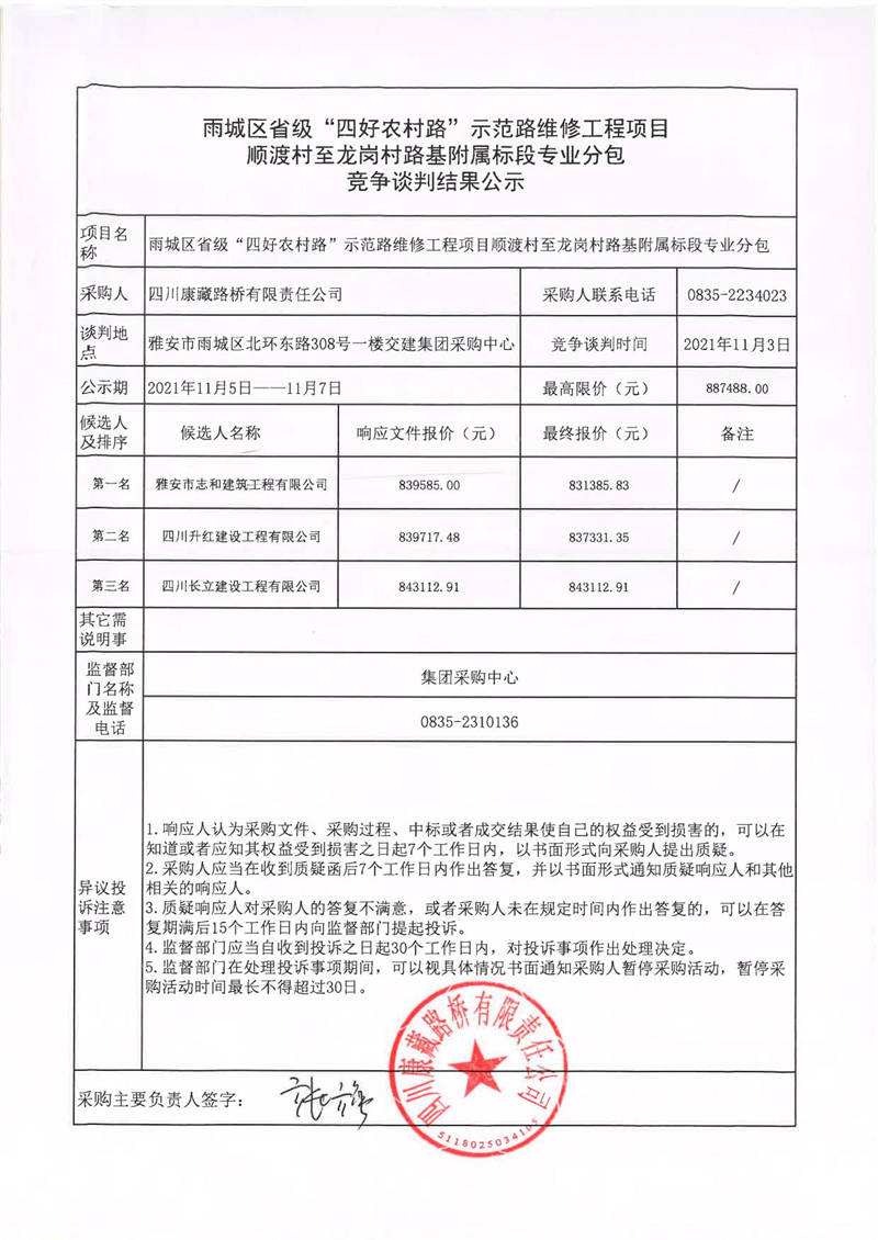 四川康藏路橋有限責(zé)任公司雨城區(qū)省級“四好農(nóng)村路”示范路維修工程項(xiàng)目順渡村至龍崗村路基附屬標(biāo)段專業(yè)分包競爭談判結(jié)果公示