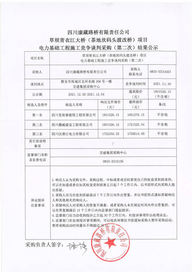 四川康藏路橋有限責任公司草壩青衣江大橋(茶地坎碼頭渡改橋)項目電力基礎工程施工競爭談判采購(第二次)結果公示