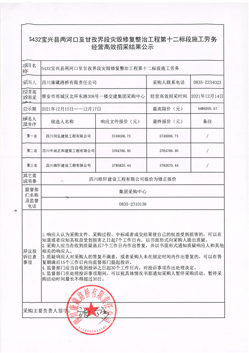 四川康藏路橋有限責(zé)任公司S432線寶興縣兩河口至甘孜界段災(zāi)毀修復(fù)整治工程第十二標(biāo)段施工勞務(wù)經(jīng)營高效招采結(jié)果公示