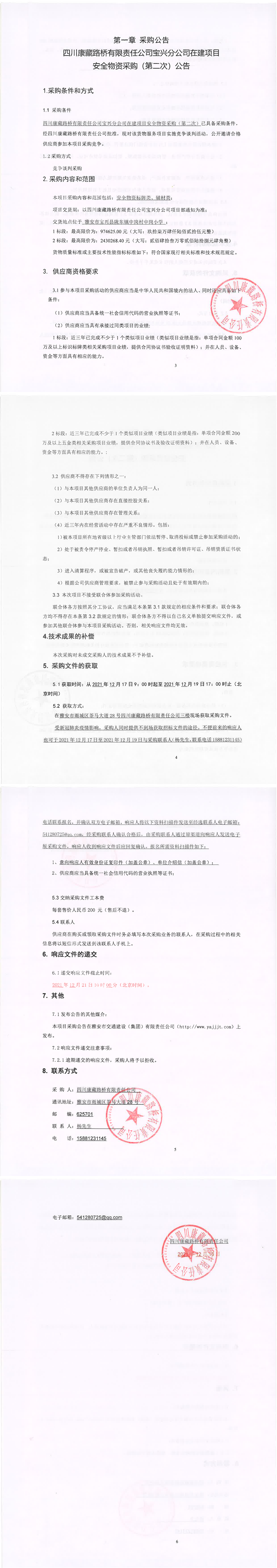 四川康藏路橋有限責(zé)任公司寶興分公司在建項(xiàng)目安全物資采購(gòu)(第二次)公告