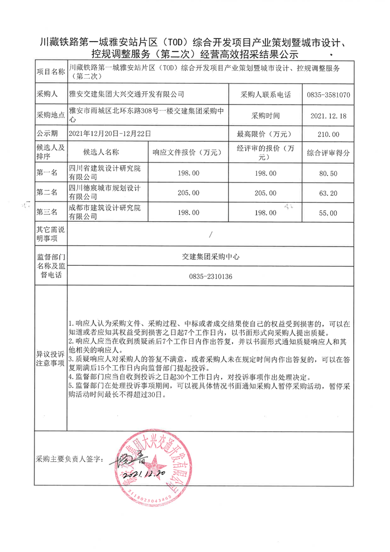 雅安交建集團大興交通開發(fā)有限公司川藏鐵路第一城雅安站片區(qū)(TOD)綜合開發(fā)項目產(chǎn)業(yè)策劃暨城市設(shè)計、控規(guī)調(diào)整服務(wù)(第二次)經(jīng)營高效招采結(jié)果公示