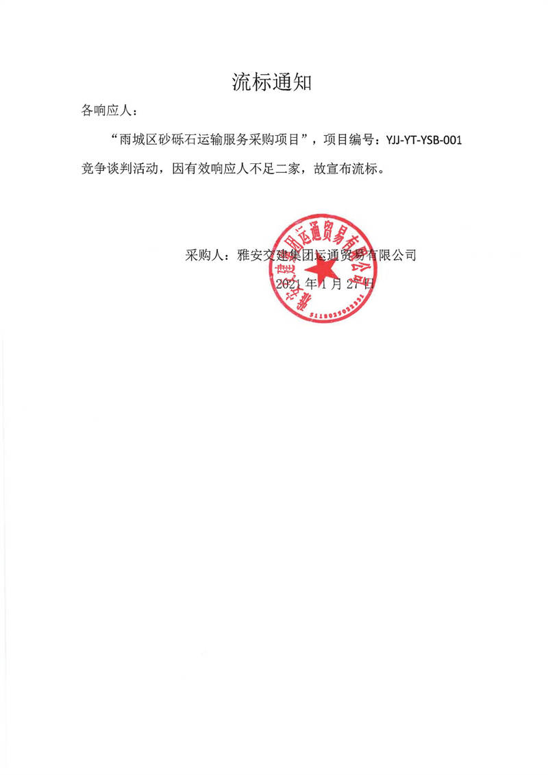 雅安交建集團運通貿(mào)易有限公司雨城區(qū)砂礫石運輸服務采購項目流標通知