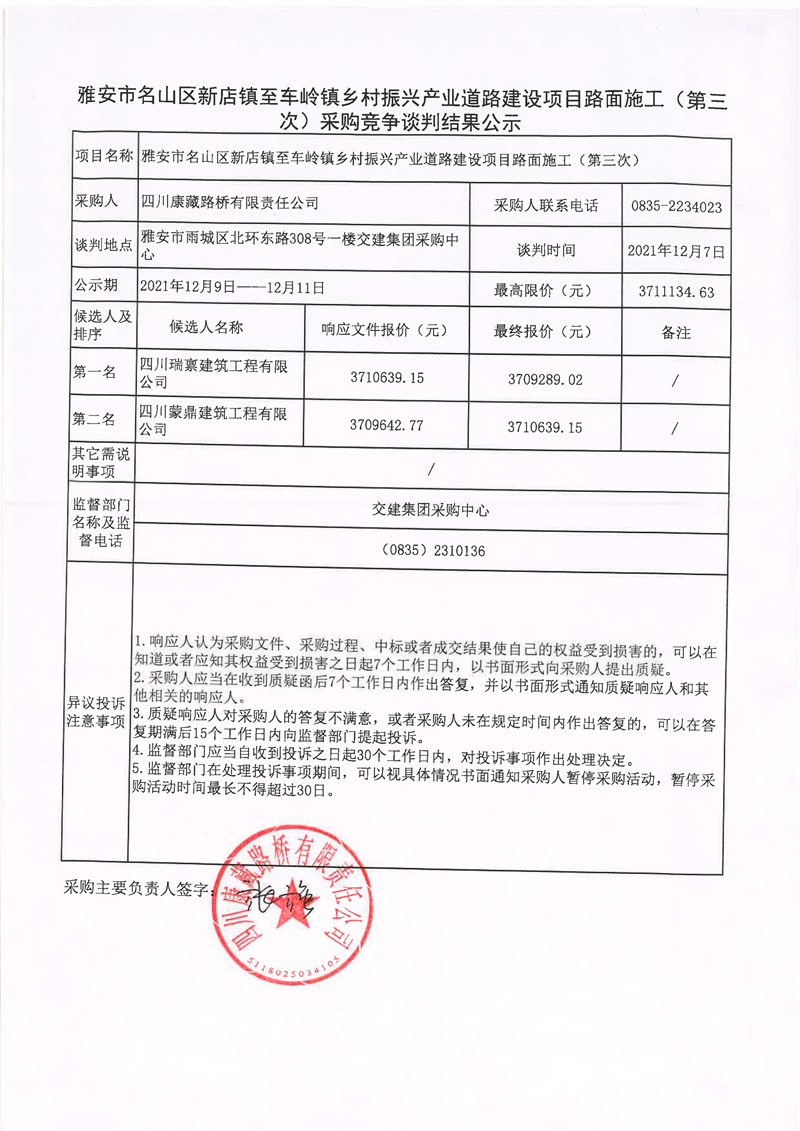 四川康藏路橋有限責(zé)任公司雅安市名山區(qū)新店鎮(zhèn)至車嶺鎮(zhèn)鄉(xiāng)村振興產(chǎn)業(yè)道路建設(shè)項(xiàng)目路面施工(第三次)采購競爭談判結(jié)果公示