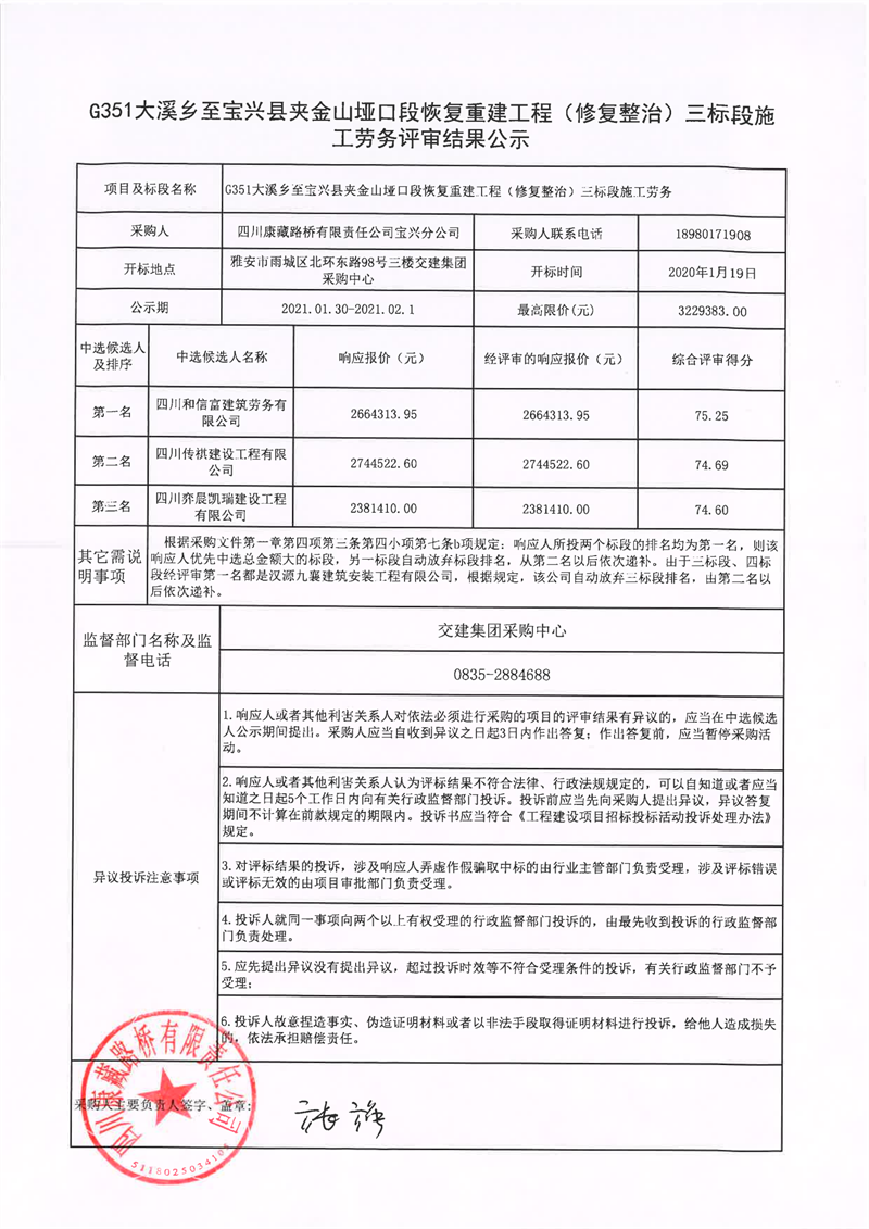 四川康藏路橋有限責任公司G351大溪鄉(xiāng)至寶興縣夾金山埡口段恢復(fù)重建工程(修復(fù)整治)四標段施工勞務(wù)評審結(jié)果公示