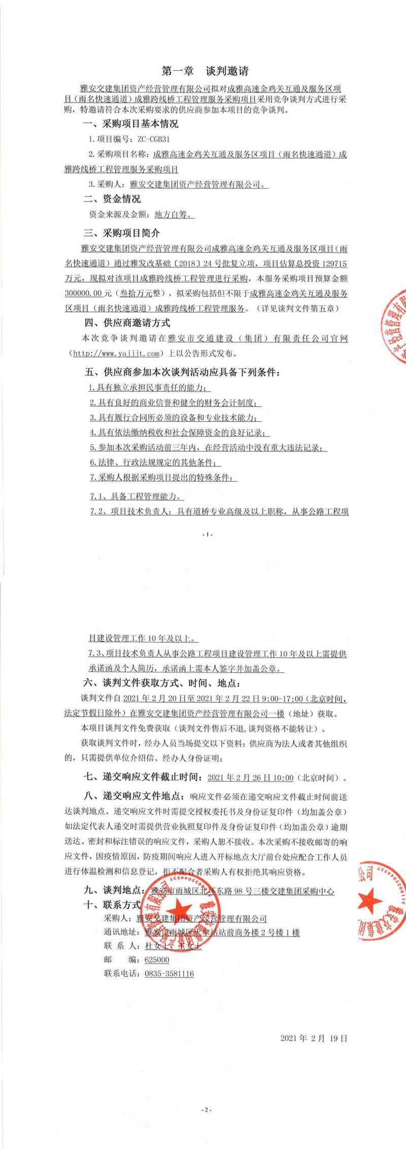 雅安交建集團資產(chǎn)經(jīng)營管理有限公司成雅高速金雞關(guān)互通及服務區(qū)項目(雨名快速通道)成雅跨線橋工程管理服務采購項目競爭談判公告
