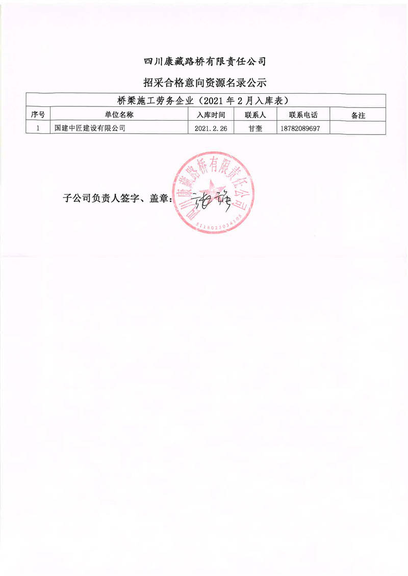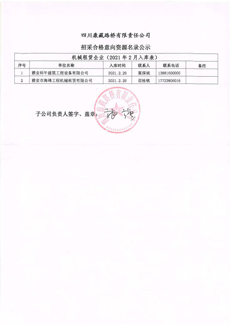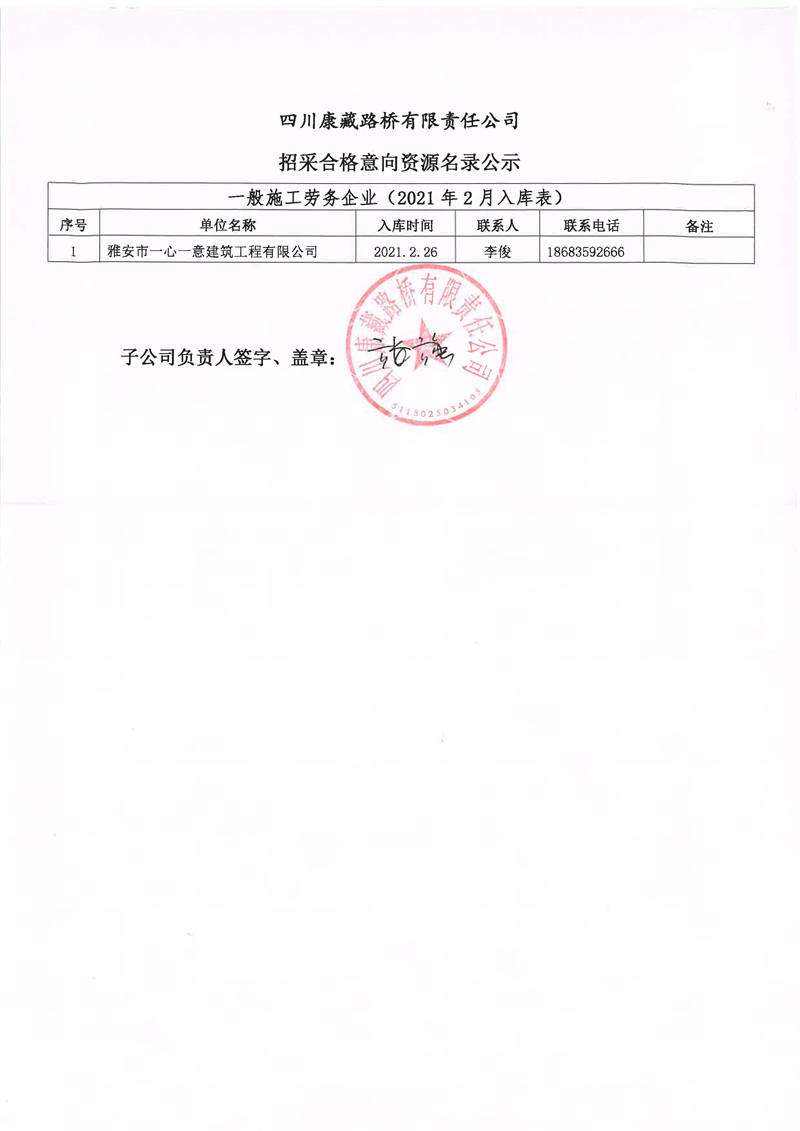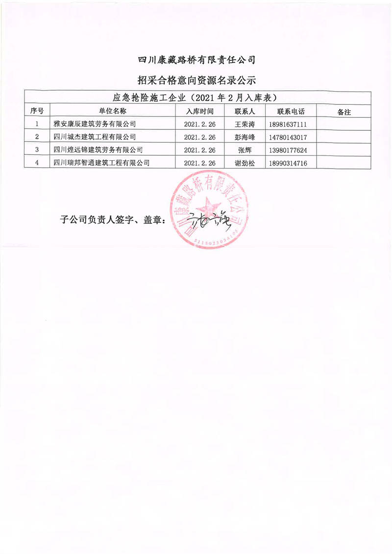 四川康藏路橋有限責任公司招采合格意向資源名錄補錄公示