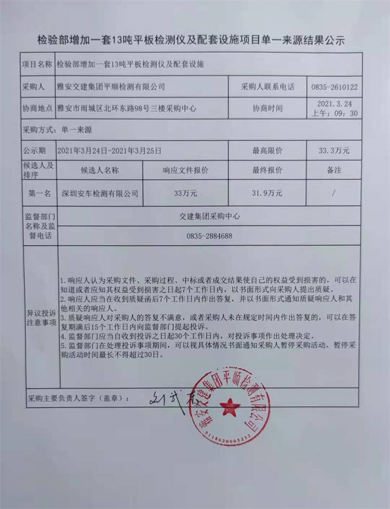 雅安交建集團(tuán)平順檢測有限公司檢驗(yàn)部增加一套13噸平板檢測儀及配套設(shè)施項(xiàng)目單一來源結(jié)果公示
