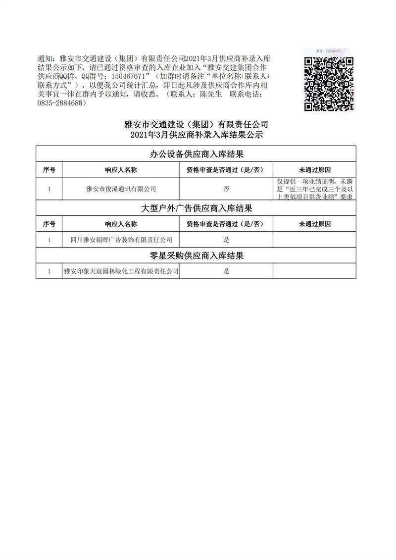 雅安市交通建設(shè)(集團)有限責(zé)任公司2021年3月供應(yīng)商補錄入庫結(jié)果公示