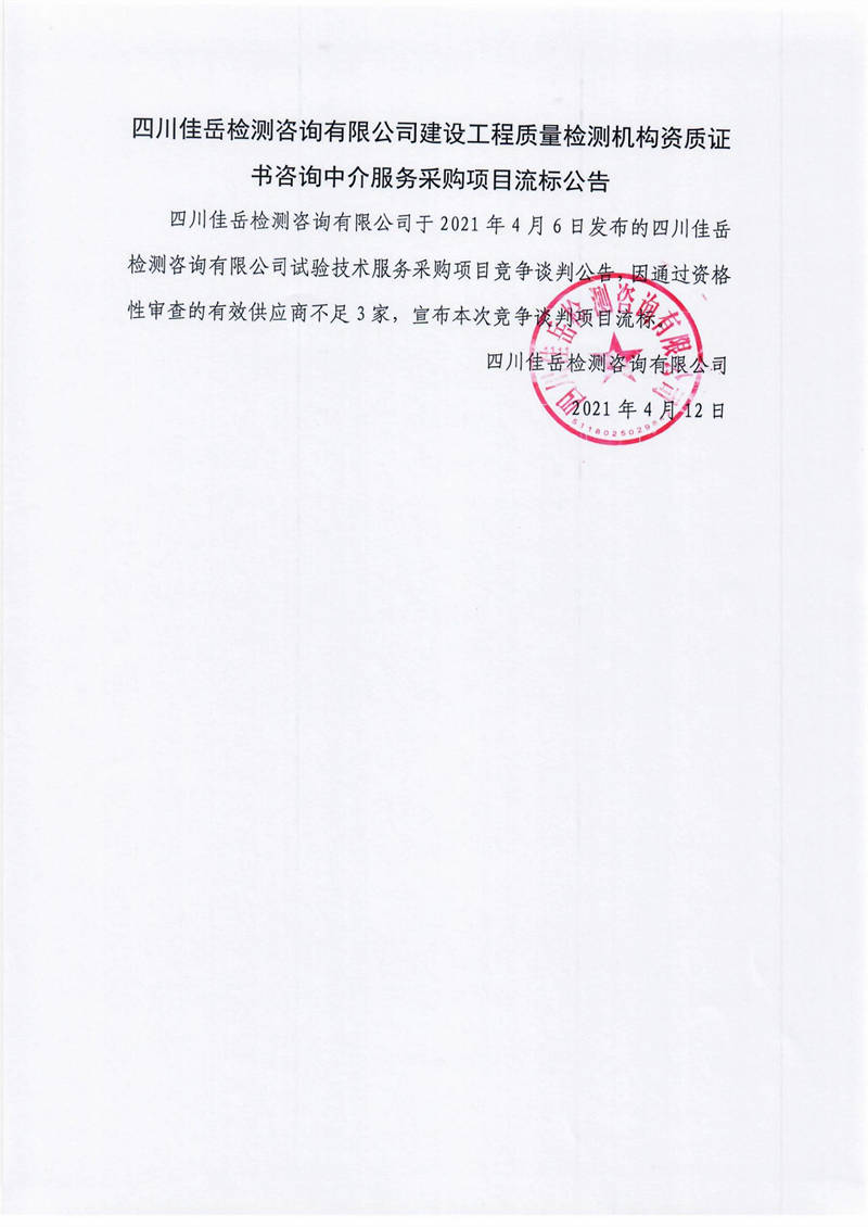 四川佳岳檢測咨詢有限公司建設(shè)工程質(zhì)量檢測機(jī)構(gòu)資質(zhì)證書咨詢中介服務(wù)采購項目流標(biāo)公告