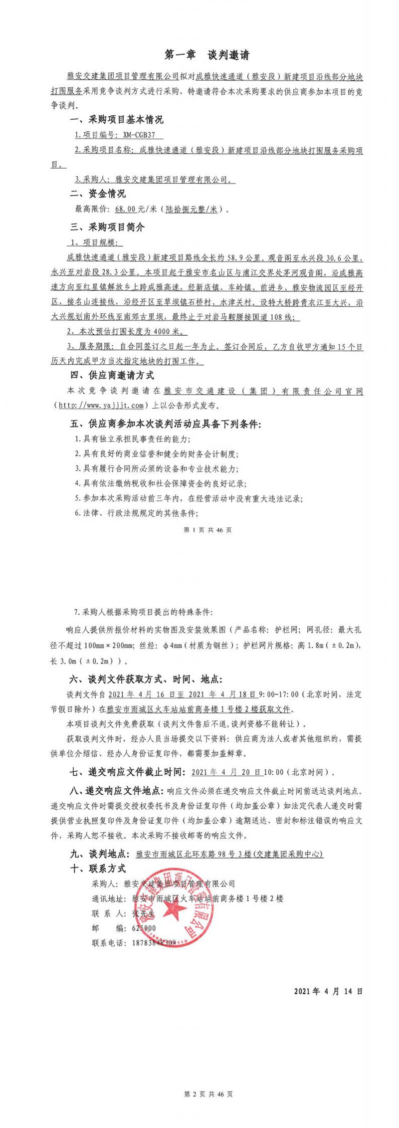 雅安交建集團(tuán)項目管理有限公司成雅快速通道(雅安段)新建項目沿線部分地塊打圍服務(wù)采購項目競爭談判公告
