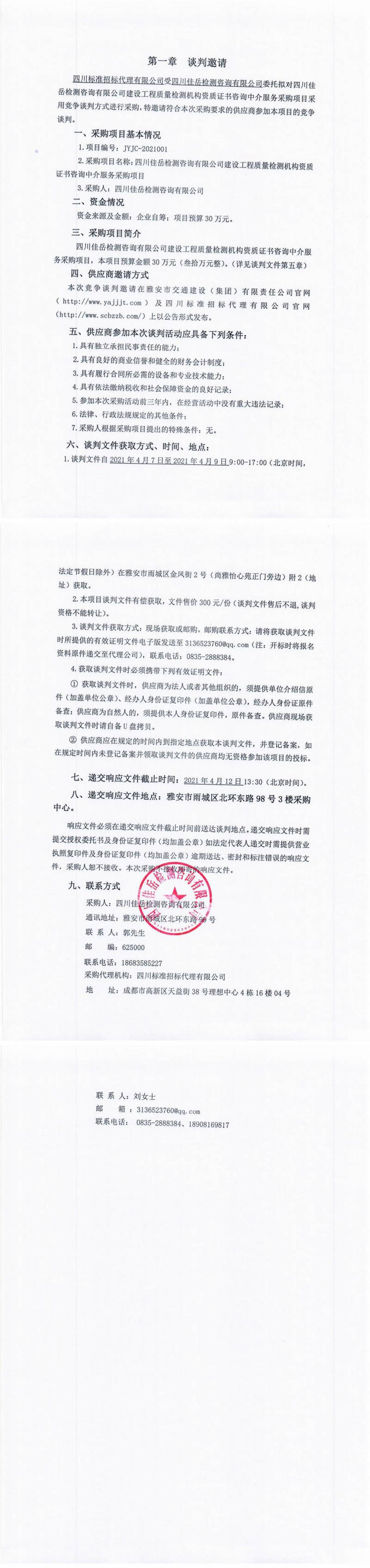 四川佳岳檢測咨詢有限公司建設工程質(zhì)量檢測機構(gòu)資質(zhì)證書咨詢中介服務采購項目競爭談判公告