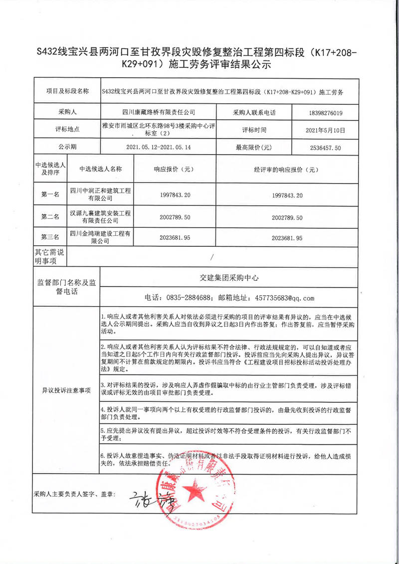 四川康藏路橋有限責任公司S432線寶興縣兩河口至甘孜界段災毀修復整治工程第四標段(K17+208-K29+091)施工勞務評審結(jié)果公示