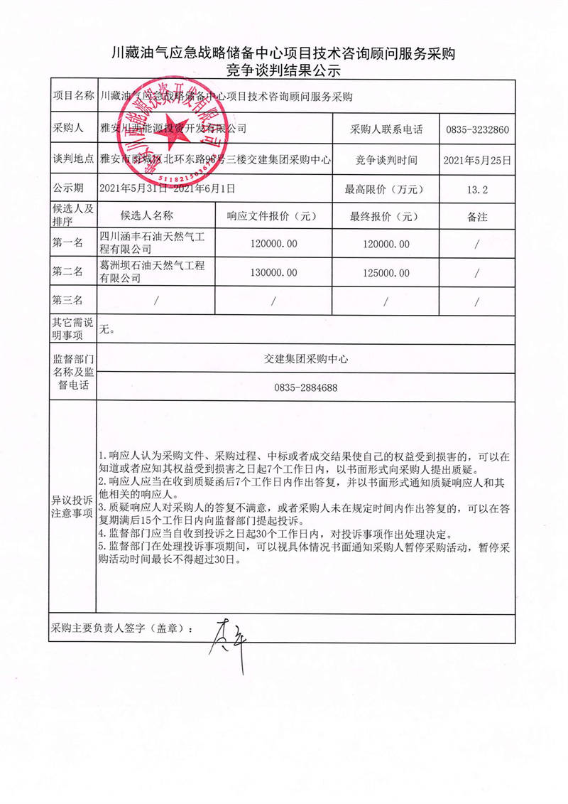 雅安川西能源投資開發(fā)有限公司川藏油氣應(yīng)急戰(zhàn)略儲(chǔ)備中心項(xiàng)目技術(shù)咨詢顧問服務(wù)采購競爭談判結(jié)果公示
