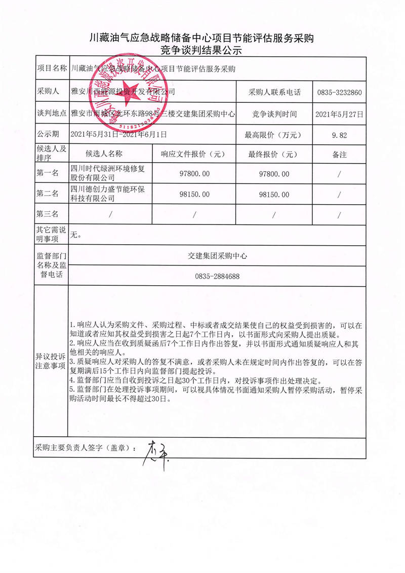 雅安川西能源投資開(kāi)發(fā)有限公司川藏油氣應(yīng)急戰(zhàn)略?xún)?chǔ)備中心項(xiàng)目節(jié)能評(píng)估服務(wù)采購(gòu)競(jìng)爭(zhēng)談判結(jié)果公示
