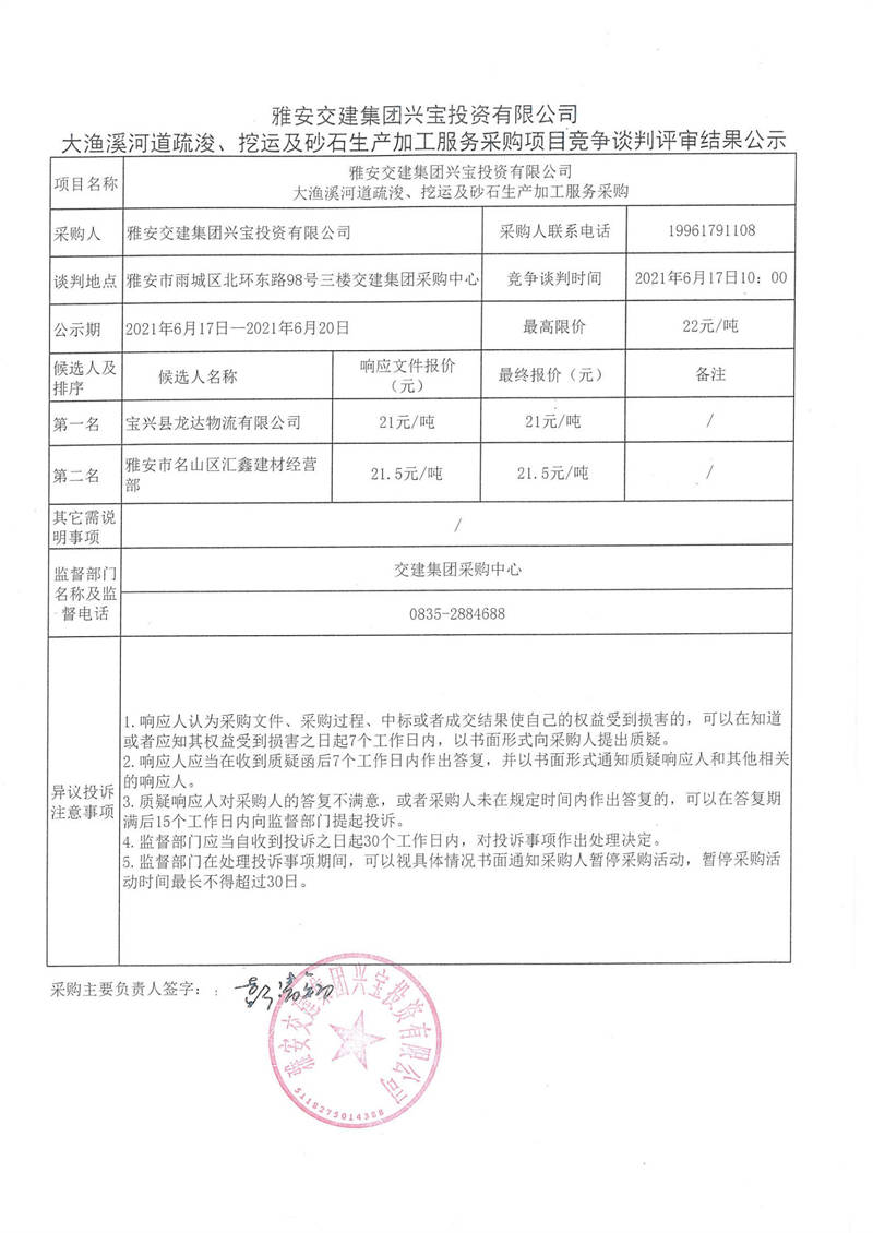 雅安交建集團興寶投資有限公司大漁溪河道疏浚、挖運及砂石生產(chǎn)加工服務采購項目競爭談判評審結果公示