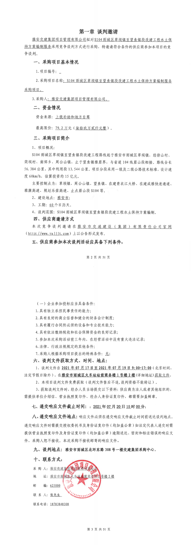 雅安交建集團(tuán)項(xiàng)目管理有限公司S104雨城區(qū)草壩鎮(zhèn)至望魚段改建工程水土保持方案編制服務(wù)采購(gòu)項(xiàng)目競(jìng)爭(zhēng)談判公告