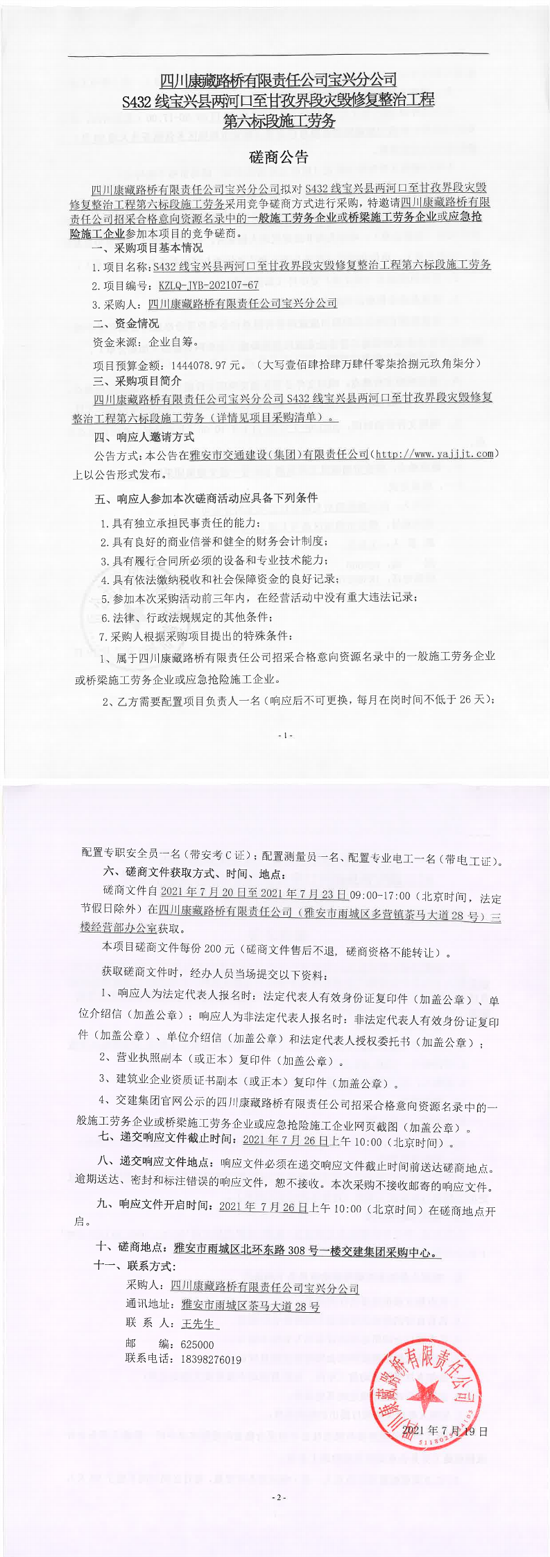 四川康藏路橋有限責任公司寶興分公司S432線寶興縣兩河口至甘孜界段災毀修復整治工程第六標段施工勞務磋商公告