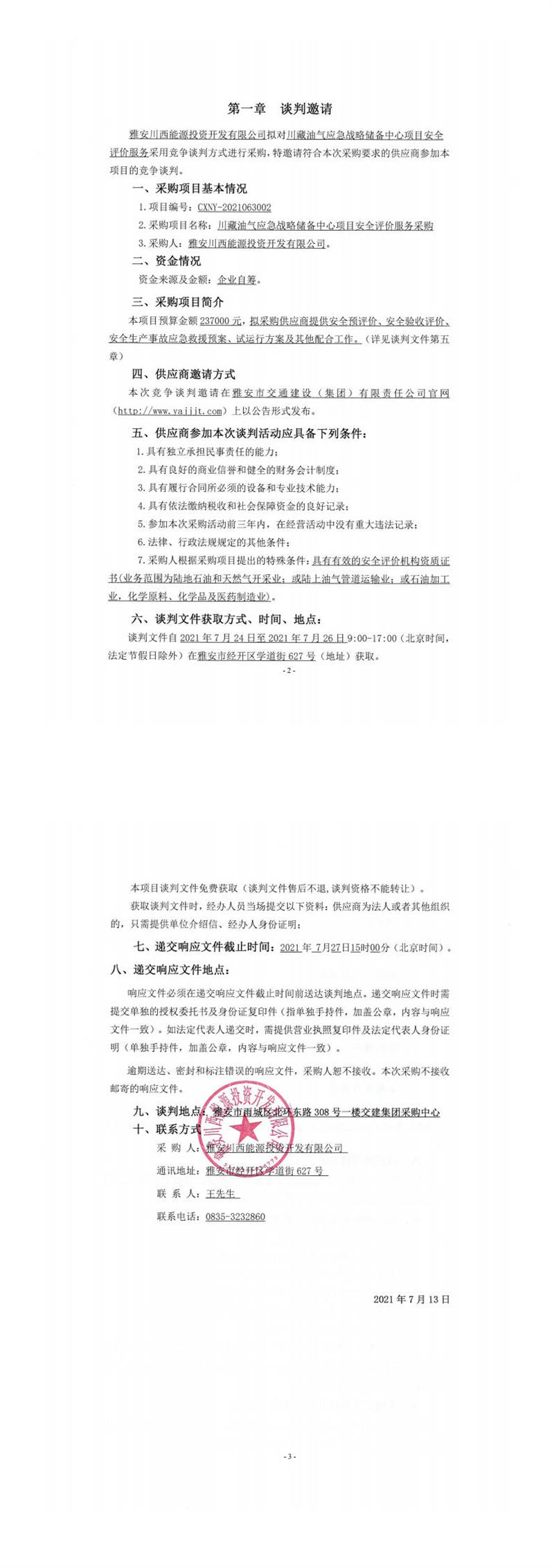 雅安川西能源投資開發(fā)有限公司川藏油氣應(yīng)急戰(zhàn)略儲(chǔ)備中心項(xiàng)目安全評(píng)價(jià)服務(wù)采購(gòu)競(jìng)爭(zhēng)談判公告