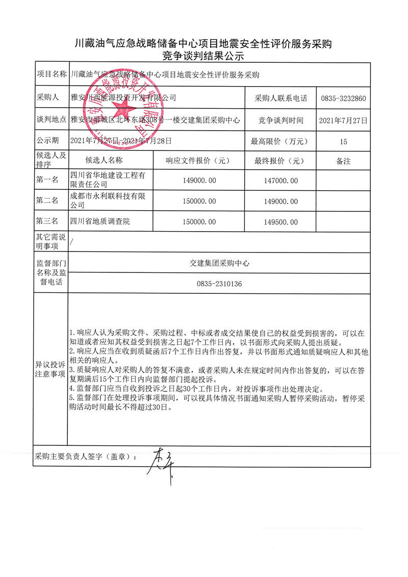 雅安川西能源投資開發(fā)有限公司川藏油氣應(yīng)急戰(zhàn)略儲(chǔ)備中心項(xiàng)目地震安全性評(píng)價(jià)服務(wù)采購(gòu)競(jìng)爭(zhēng)談判結(jié)果公示