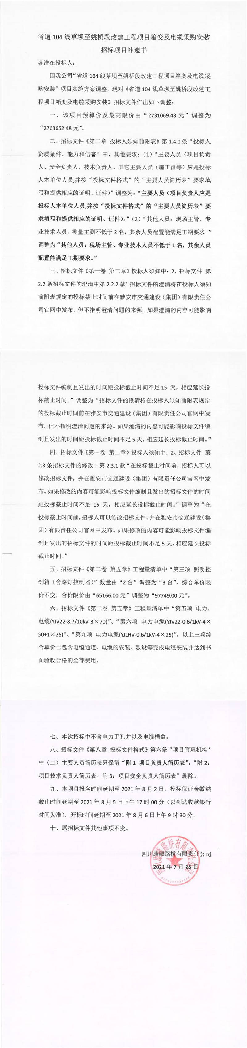 四川康藏路橋有限責(zé)任公司省道104線草壩至姚橋段改建項目箱變及電纜采購安裝招標(biāo)項目補遺書