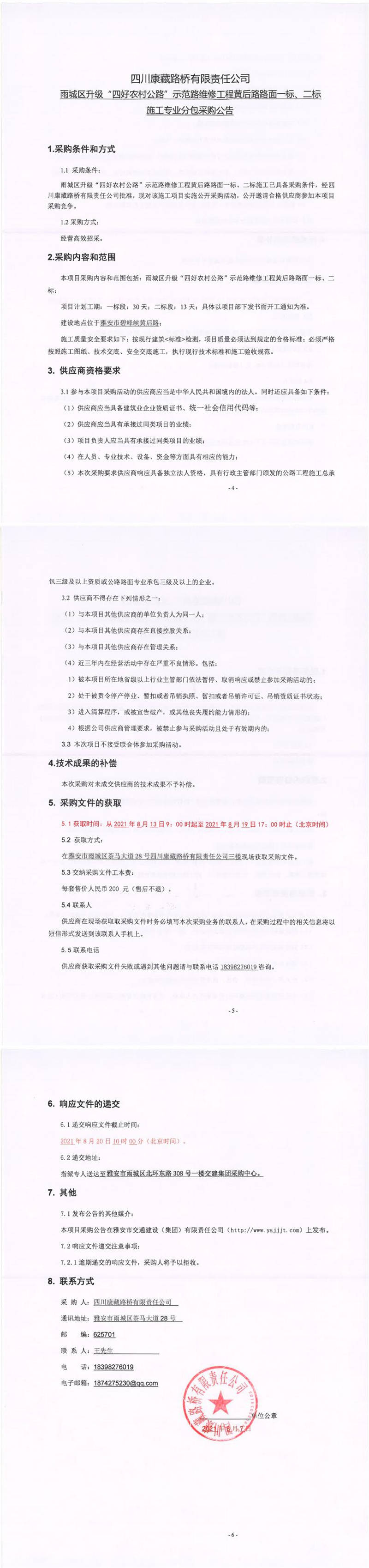 四川康藏路橋有限責任公司雨城區(qū)升級“四好農(nóng)材公路”示范路維修工程黃后路路面一標、二標施工專業(yè)分包采購公告